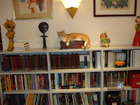 * Na gravura: a gatinha Ingrid Bergman de Andrade tenta resolver o seguinte problema: uma gata está deitada numa caixa de canetas. A caixa está sobre a estante do corredor dos quartos. Quantos objectos estão debaixo da gata? Proposta de pergunta para o exame nacional de matemática do 9º ano.